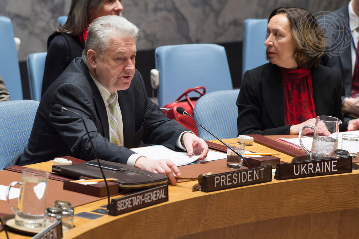 Volodymyr Yelchenko left), Permanent Representative of Ukraine to the UN and President of the Security Council for February, chairs the Council’s meeting on the situation in Guinea-Bissau.