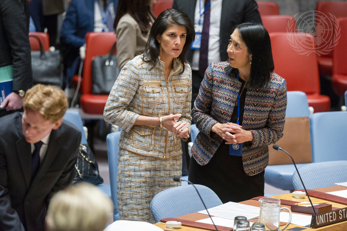 Nikki R. Haley (centre), United States Permanent Representative to the UN, with Michele J. Sison, Deputy US Permanent Representative, at the Security Council debate on the topic, “Maintenance of international peace and security: Conflicts in Europe”.