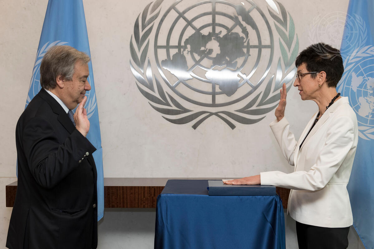 Secretary-General António Guterres (left) swears in Ursula Mueller, as Assistant Secretary-General for Humanitarian Affairs and Deputy Emergency Relief Coordinator in the Office for the Coordination of Humanitarian Affairs.