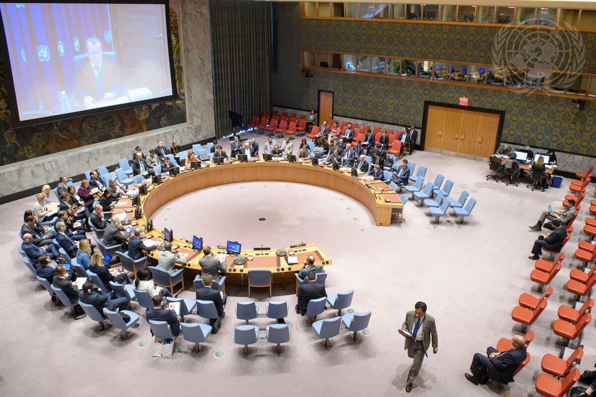 A wide view of the Security Council Chamber as Martin Kobler (shown on screen), Special Representative of the Secretary-General and Head of the UN Support Mission in Libya (UNSMIL), briefs the Council via video teleconference.
