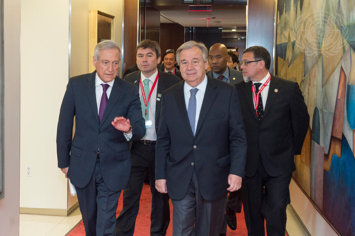 Secretary-General António Guterres (centre) meets with Heraldo Muñoz (left), Minister for Foreign Affairs of Chile.