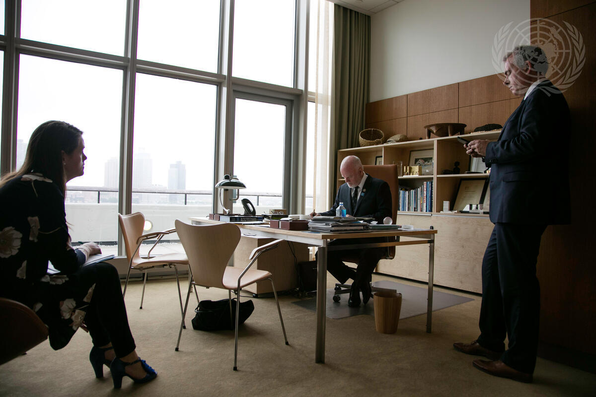 Peter Thomson (centre), President of the seventy-first session of the General Assembly, prepares in his office for the second day of the Ocean Conference taking place at UN headquarters from 5 to 9 June.