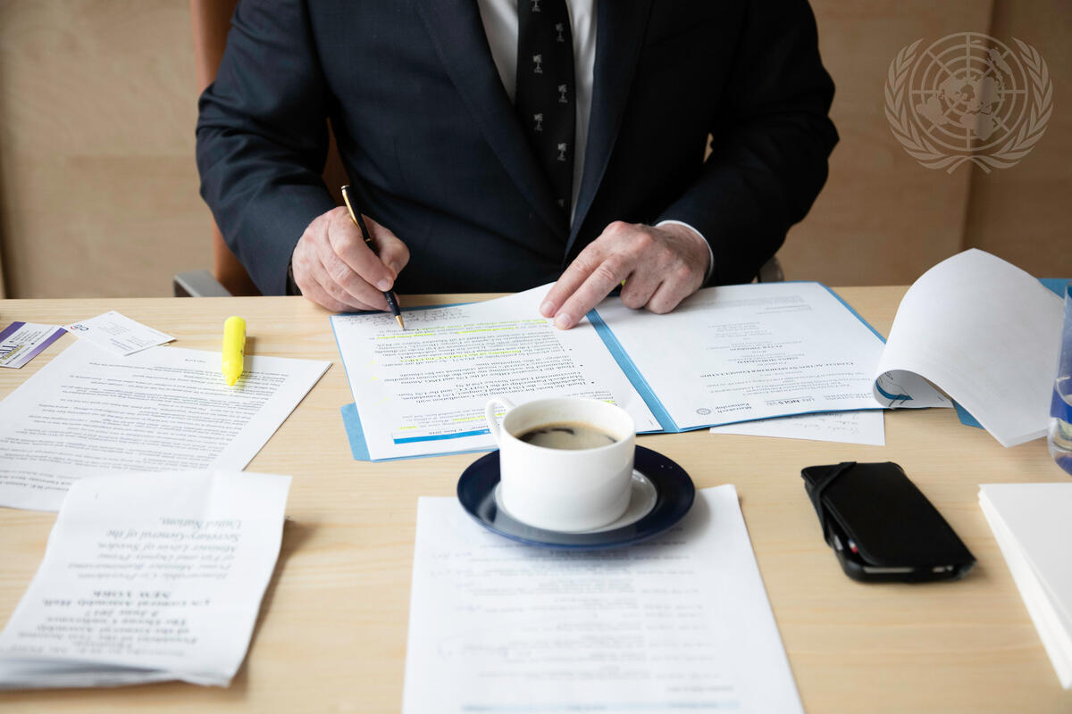 Peter Thomson, President of the seventy-first session of the General Assembly, prepares in his office for the second day of the Ocean Conference taking place at UN headquarters from 5 to 9 June.
