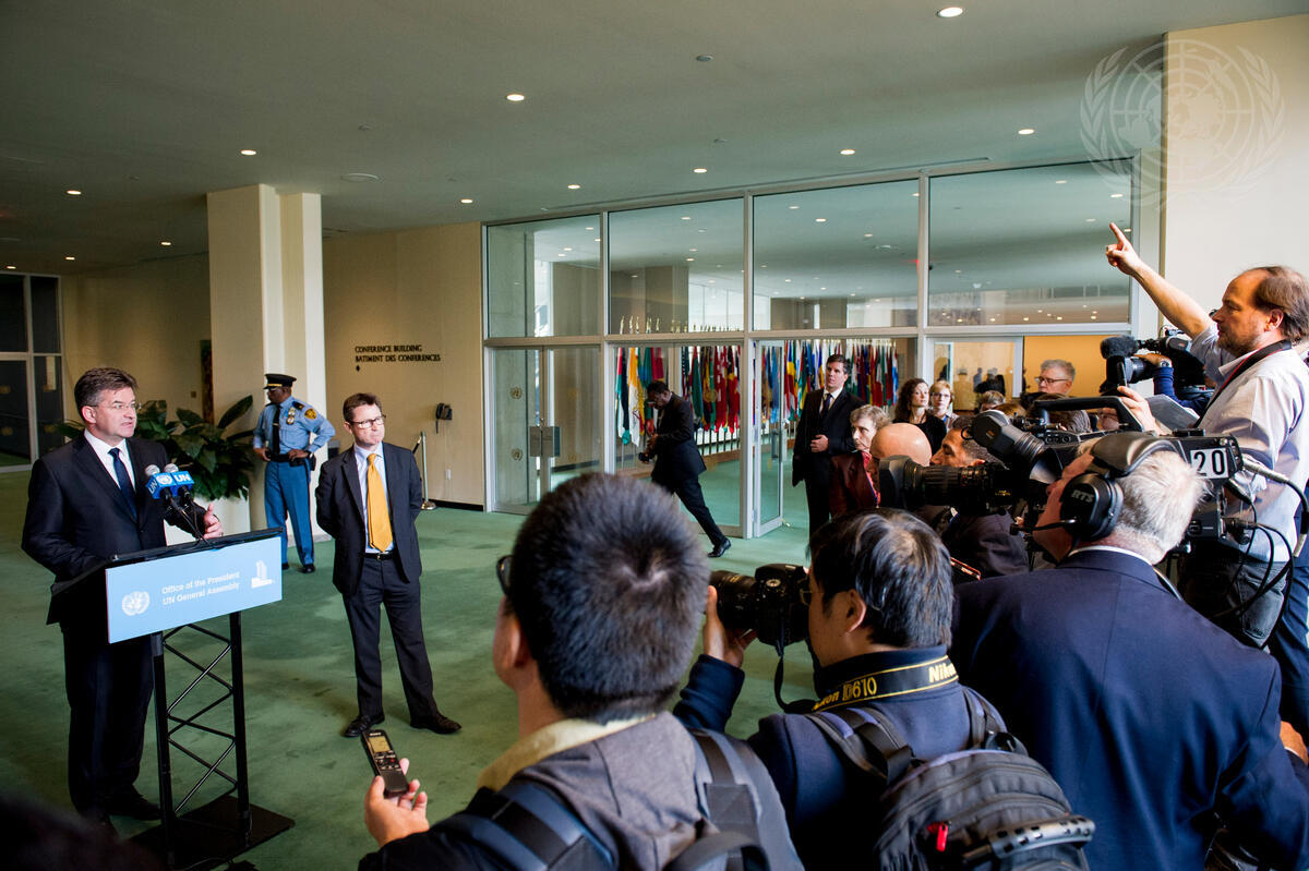 Miroslav Lajcák, Minister for Foreign and European Affairs of the Slovak Republic and President-elect of the seventy-second session of the General Assembly, briefs journalists following his election.