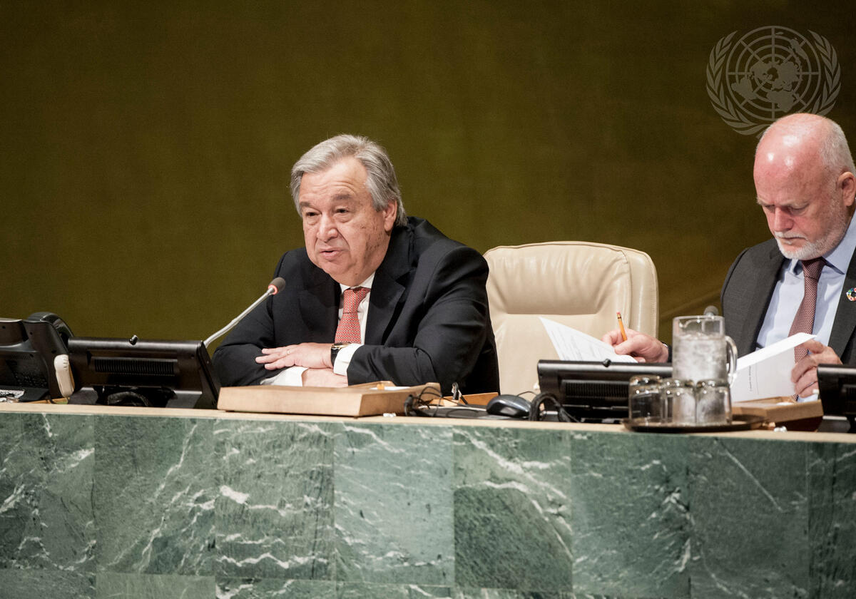 Secretary-General António Guterres addresses the Assembly following the election. To his left is Peter Thomson, President of the seventy-first session of the General Assembly.