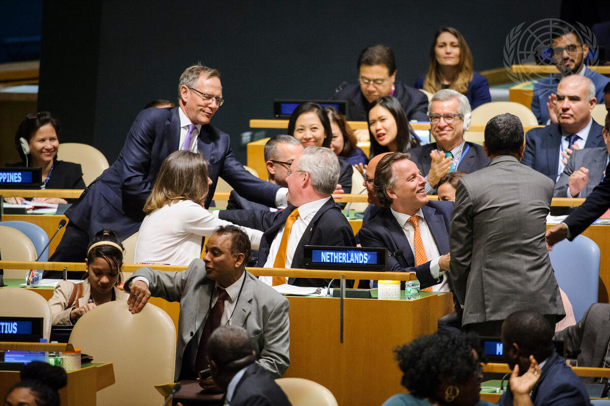The delegation of the Kingdom of the Netherlands, led by Albert Koenders (centre right), Minister for Foreign Affairs, receives congratulations from other delegates on the election.