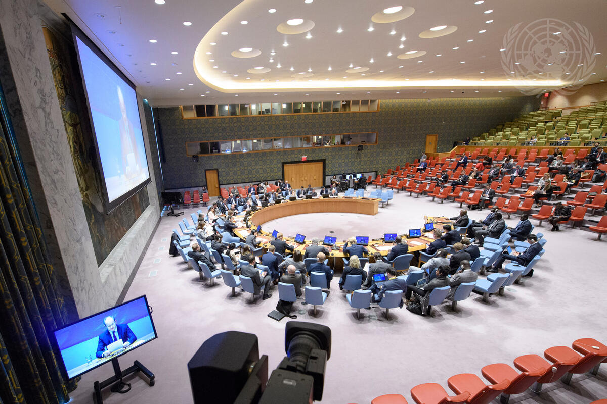 A wide view of the Security Council chamber as David Shearer, Special Representative of the Secretary-General and Head of the United Nations Mission in South Sudan (UNMISS), briefs the Council via video conference.
