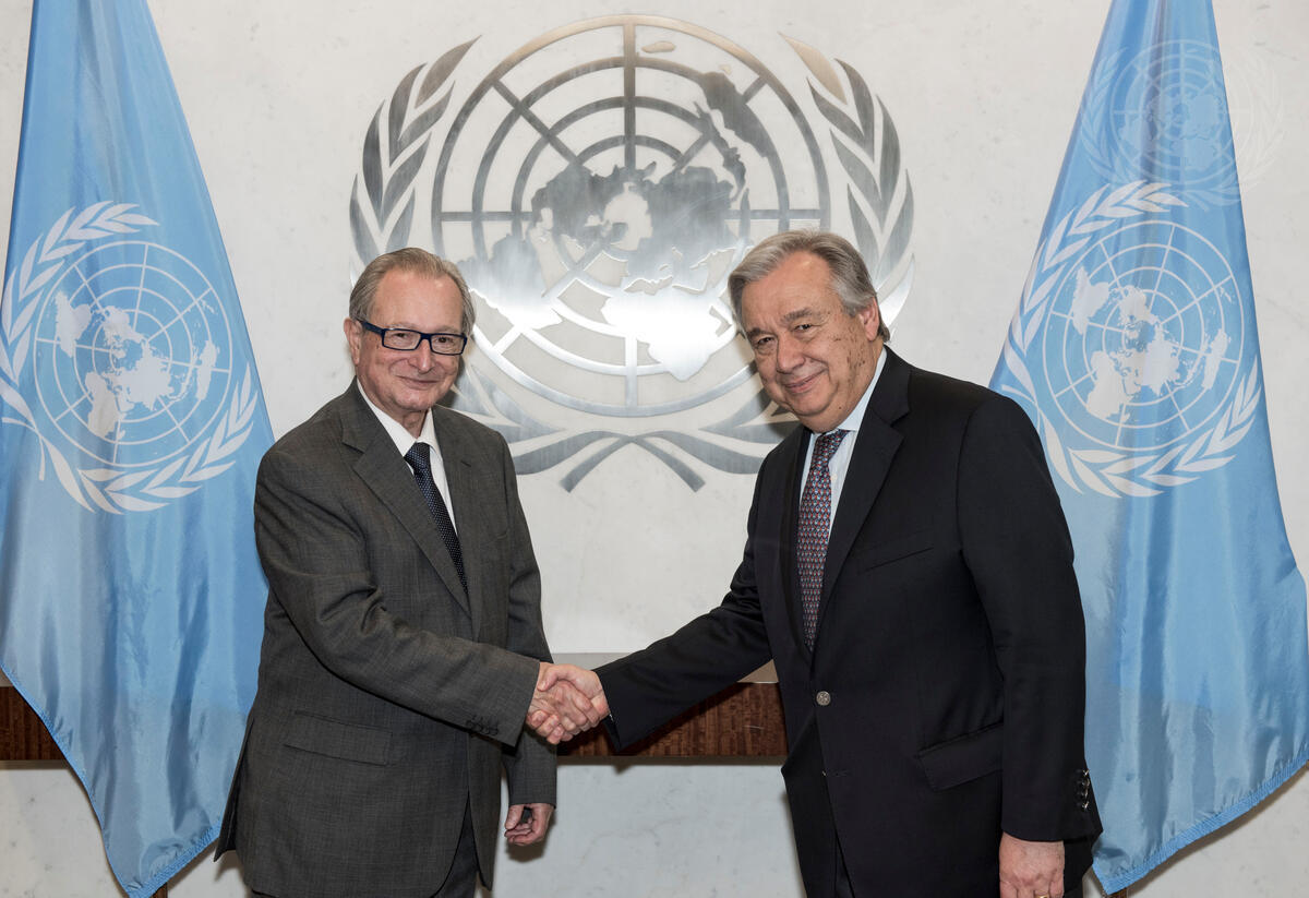 Secretary-General António Guterres (right) meets Judge Carmel Agius, President of the International Criminal Tribunal for the former Yugoslavia.