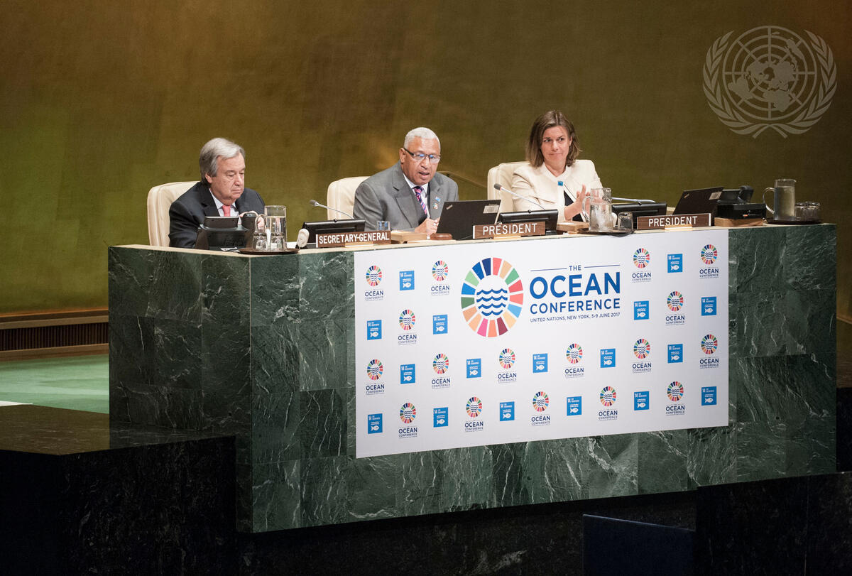 Josaia V. Bainimarama (centre), Prime Minister of the Republic of Fiji and Co-President of the Conference addresses delegates. He is flanked by Secretary-General António Guterres (left) and Isabella Lövin, Deputy Prime Minister of Sweden and Co-President of Conference.