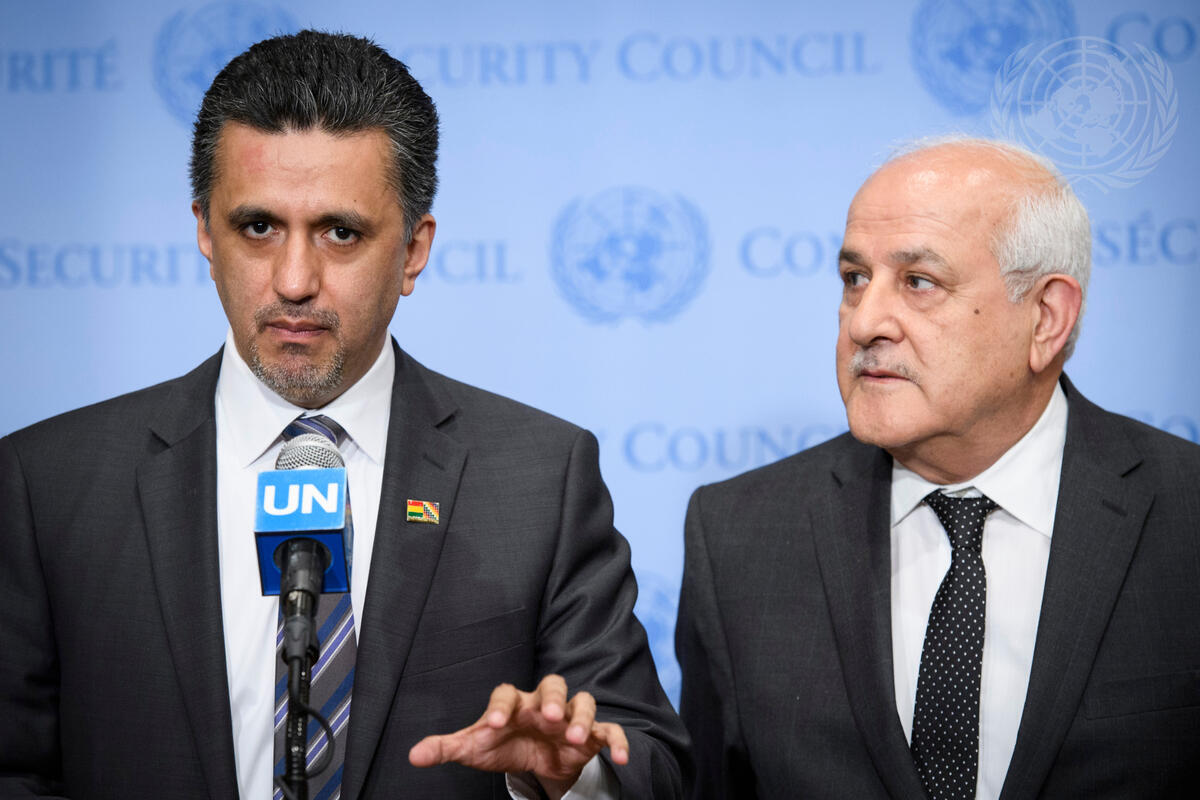 Sacha Sergio Llorentty Solíz (left), Permanent Representative of the Plurinational State of Bolivia to the UN and President of the Security Council for the month of June, speaks to journalists following a Security Council meeting on the situation in the Middle East, including the Palestinian question.