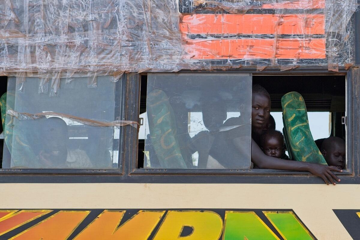 Refugees arriving at Imvepi settlement on a bus from the South Sudan border.