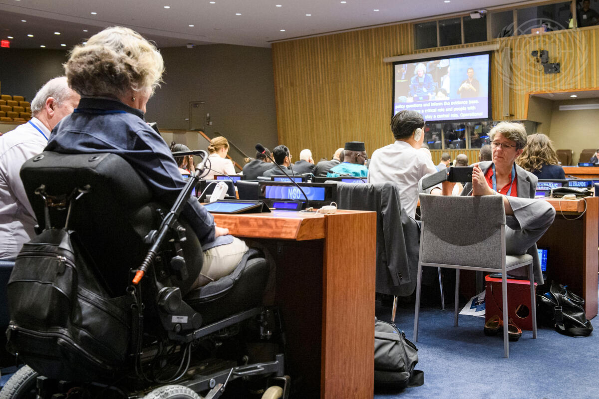 Theresia Degener (right), Chair of the Committee on the Rights of Persons with Disabilities, takes a photo of during a meeting on the third and final day of the tenth session of the Conference of States Parties to the Convention on the Rights of Persons with Disabilities.