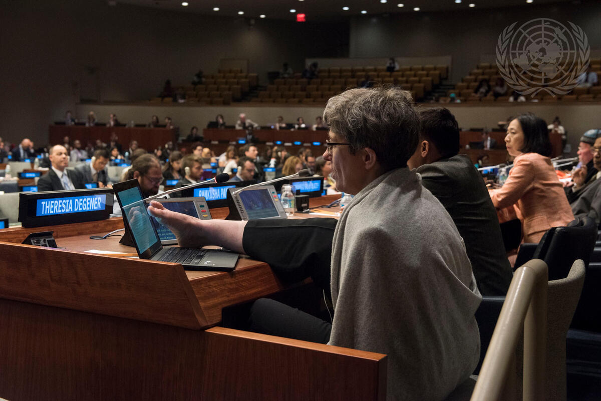 Theresia Degener (foreground left), Chair of the Committee on the Rights of Persons with Disabilities, addresses a roundtable on inclusion and full participation of persons with disabilities in humanitarian action. The discussion took place as part of the tenth session of the Conference of States Parties to the Convention on the Rights of Persons with Disabilities.