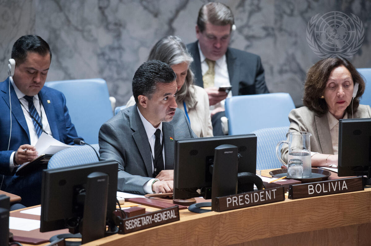 Sacha Sergio Llorentty Solíz (front left), Permanent Representative of the Plurinational State of Bolivia to the UN and Council President for June, chairs the Council's meeting on the situation in the Central African Republic. At right is Hasmik Egian, Director of the Security Council Affairs Division, Department of Political Affairs.