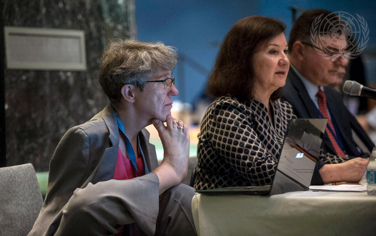 Luiza Ribeiro Viotti (second from left), Chef de Cabinet to the Secretary-General, addresses the opening meeting of the tenth session of the Conference of States Parties to the Convention on the Rights of Persons with Disabilities. She is flanked by Theresia Degener (left), Chair of the Committee on the Rights of Persons with Disabilities; and Georgi Panayotov, Permanent Representative of Bulgaria to the UN and President of the Conference.