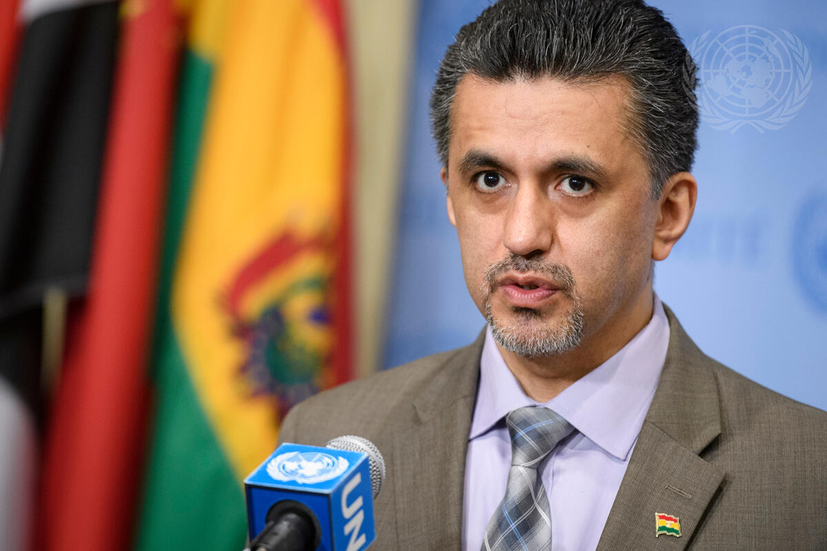Sacha Sergio Llorentty Solíz, Permanent Representative of the Plurinational State of Bolivia to the UN and President of the Security Council for June, speaks to journalists following closed Council consultations on the situation in Mali.