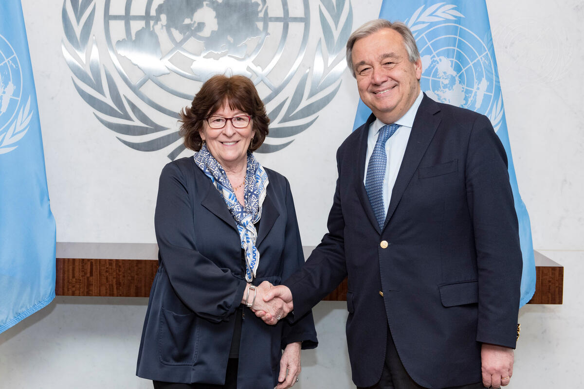 Secretary-General António Guterres (right) meets with Louise Arbour, his Special Representative for International Migration.