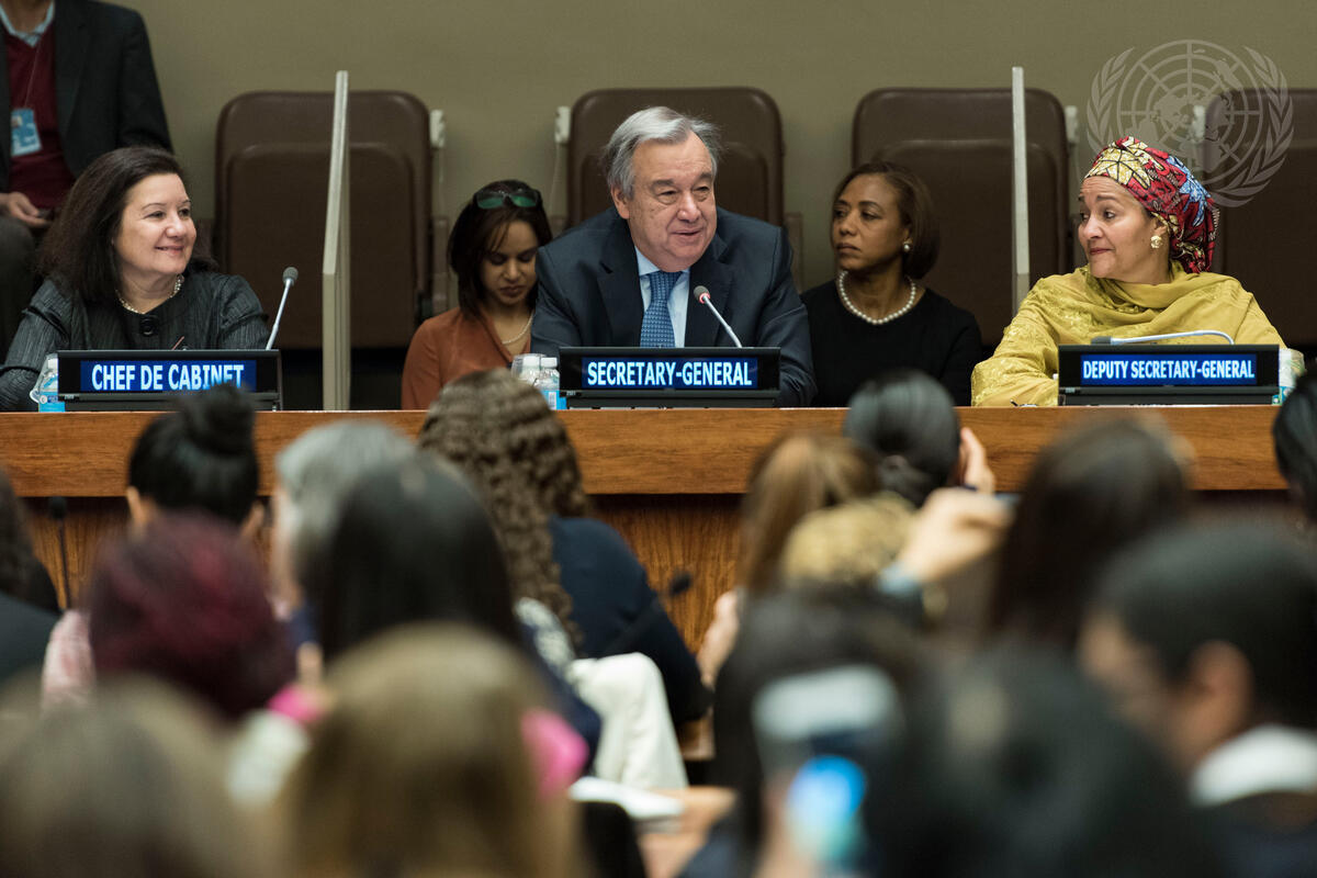 Secretary-General António Guterres (centre) holds a town hall meeting with representatives of Non-Governmental Organizations associated with the sixty-first session of the Commission on the Status of Women (CSW), which is taking place at UN headquarters from 13 to24 March. Also pictured: Maria Luiza Ribeiro Viotti (left), Chef de Cabinet to the Secretary-General; Deputy Secretary-General Amina Mohammed (right).