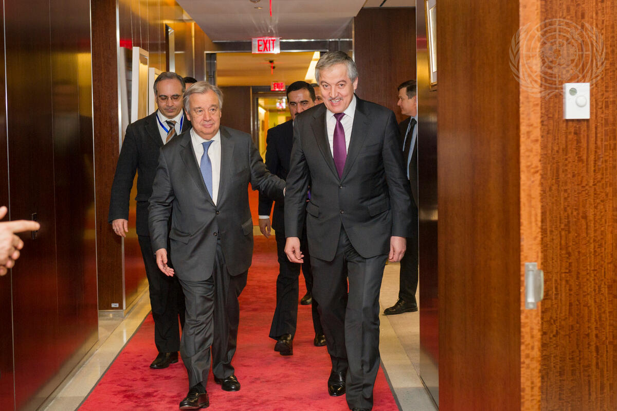 Secretary-General António Guterres (front left) meets with Sirodjidin Aslov (front right), Minister for Foreign Affairs of the Republic of Tajikistan.