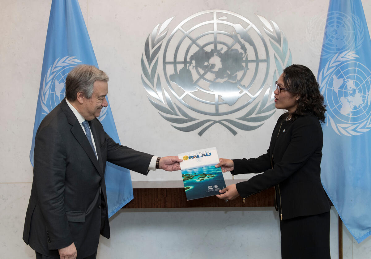 Ngedikes Olai Uludong (right), new Permanent Representative of the Republic of Palau to the United Nations, presents her credentials to Secretary-General António Guterres.