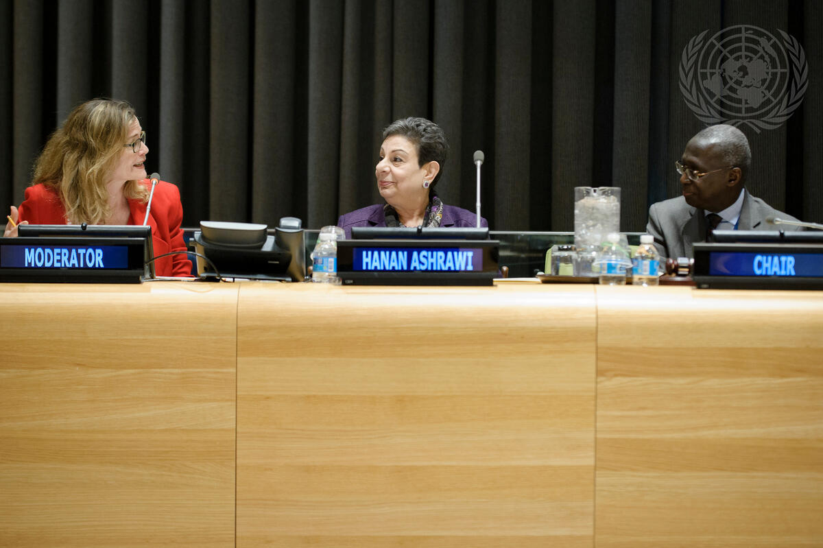 Ms. Ashrawi (centre) and Fodé Seck (right), Permanent Representative of the Republic of Senegal and Chair of the Committee, during the event.