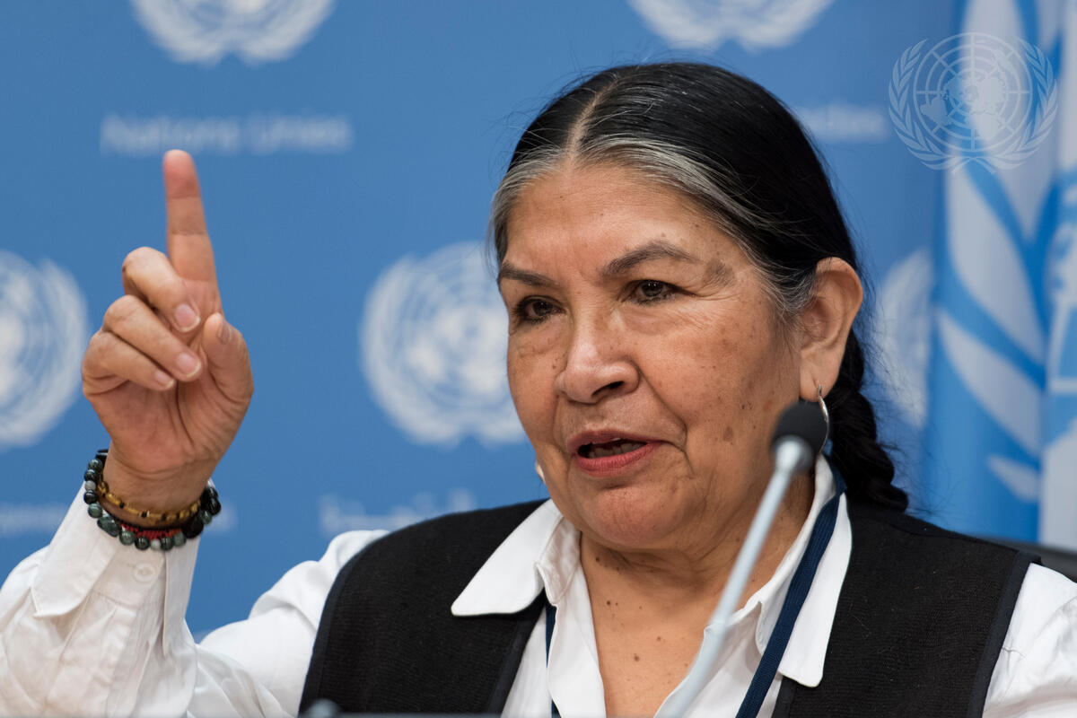 Tarcila Rivera Zea, a Quechuan activist from Peru and Director of the International Indigenous Women’s Forum (FIMI), addresses a press briefing on “Empowering Indigenous Women and Girls”. She was joined in speaking to reporters by Chandra Roy-Henriksen, Chief of the Secretariat of the Permanent Forum on Indigenous Issues, UN Department of Economic and Social Affairs (DESA); and Aminatu Samiratu Gambo, an activist of the Mbororo community in Cameroon.