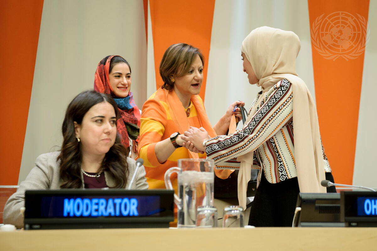 Cristina Gallach (centre right), Under-Secretary-General for Communications and Public Information, greets Ohood Al Roumi, Minister of State for Happiness of the United Arab Emirates, at the interactive discussion on “Public Policies for Happiness”, marking the International Day of Happiness (20 March). The event was co-organized by the Permanent Missions of Australia, Bhutan, Denmark, Ecuador, Rwanda, Slovenia, Thailand and the United Arab Emirates, in collaboration with the Department for Public Information (DPI) and the United Nations Sustainable Development Solutions Network (UN-SDSN).