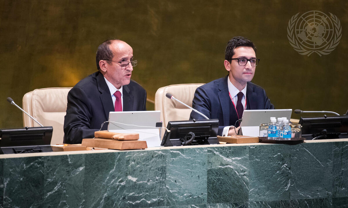 Mohamed Lemine El Haycen (left), Permanent Representative of the Islamic Republic of Mauritania to the UN and Acting President of the Assembly, chairs the meeting. At his side is Ziad Mahmassani, Political Affairs Officer in the Department of General Assembly and Conference Management.