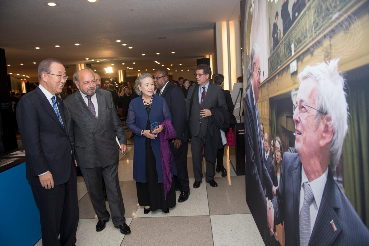 Secretary-General Ban Ki-moon (left) and his wife Yoo Soon-taek (centre), attended an exhibition entitled “Seventy years in the service of Peace and Justice”, which was unveiled on the occasion of the seventieth anniversary of the International Court of Justice. Second from left is Ronny Abraham, President of the International Court of Justice.