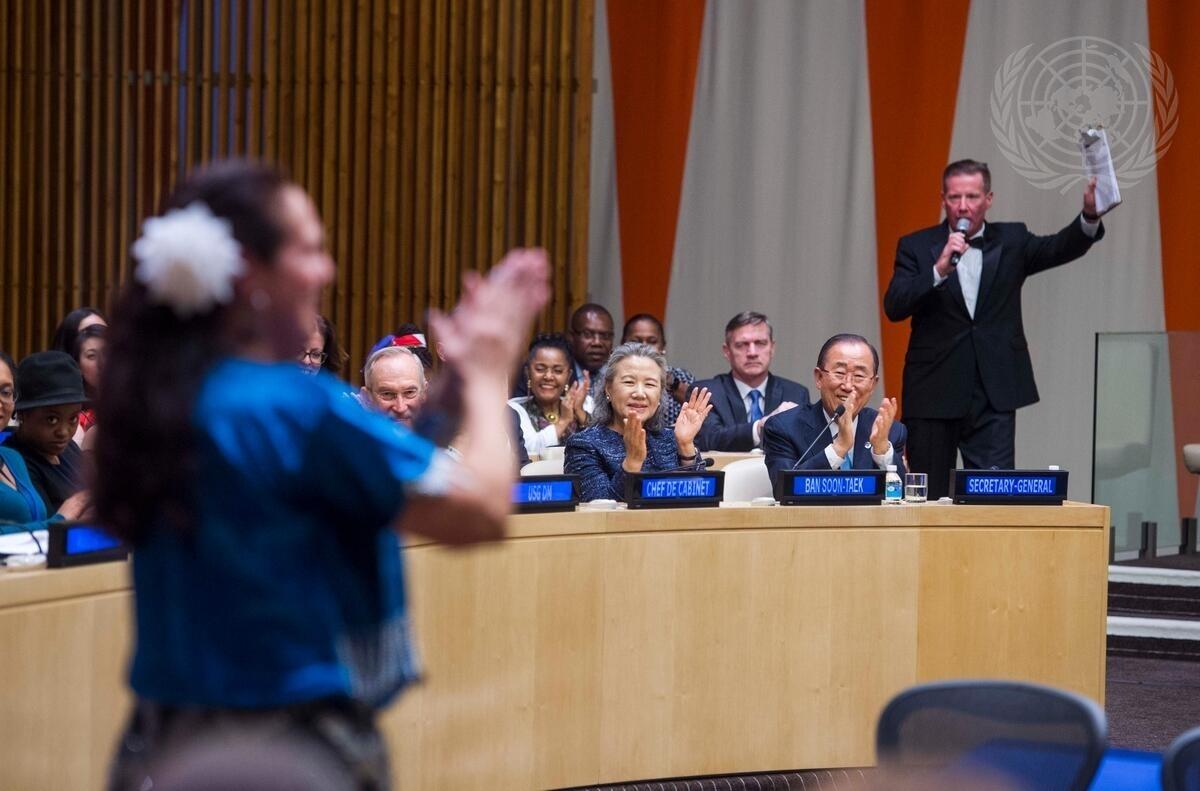 Secretary-General Ban Ki-moon (seated front right) and his wife, Yoo Soon-taek, applaud during the talent show.