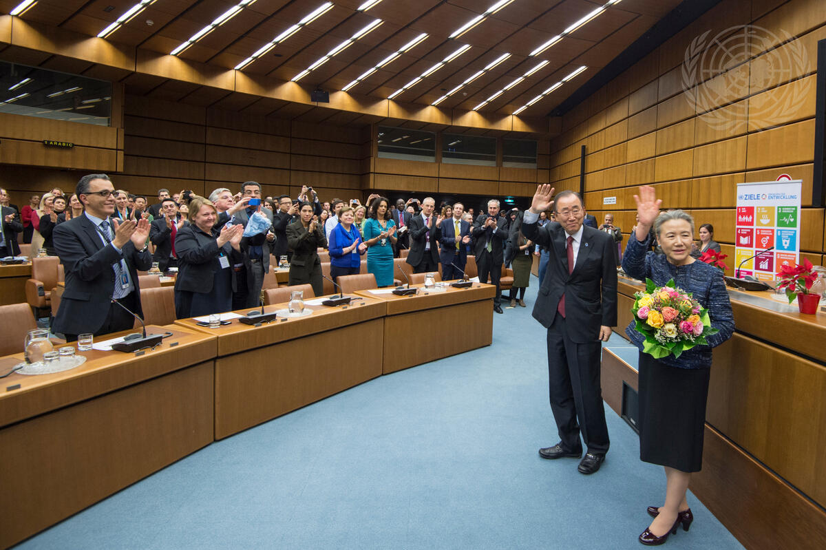 Secretary-General Ban Ki-moon (second from right) and his wife Yoo Soon-taek (right), wave to Vienna-based Organization Staff at the Vienna International Centre in Austira.