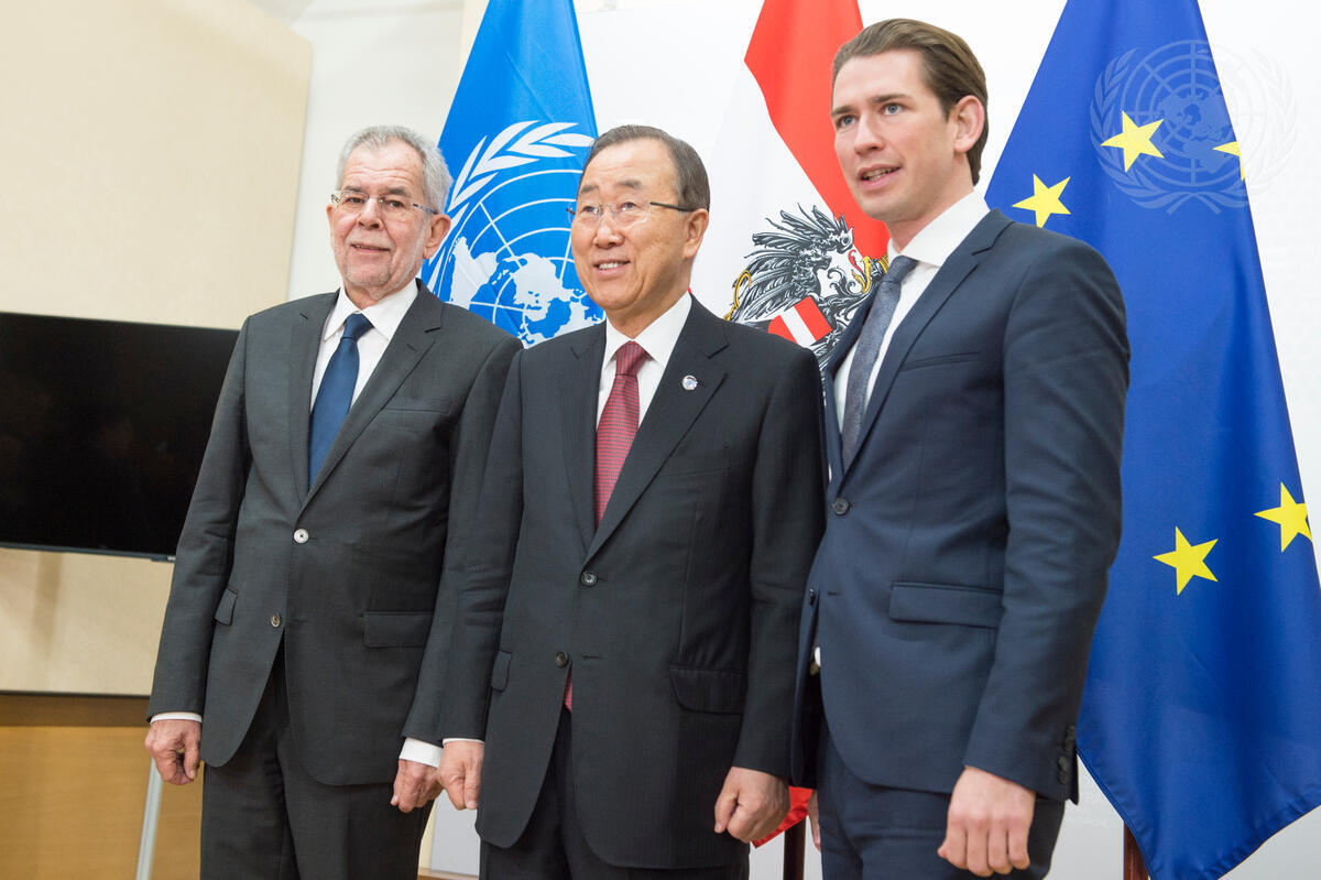 Secretary-General Ban Ki-moon (centre) meets with Alexander Van der Bellen (left), President-designate of the Republic of Austria, and Sebastian Kurz (right), Federal Minister for Europe, Integration and Foreign Affairs of the Republic of Austria, in Vienna.