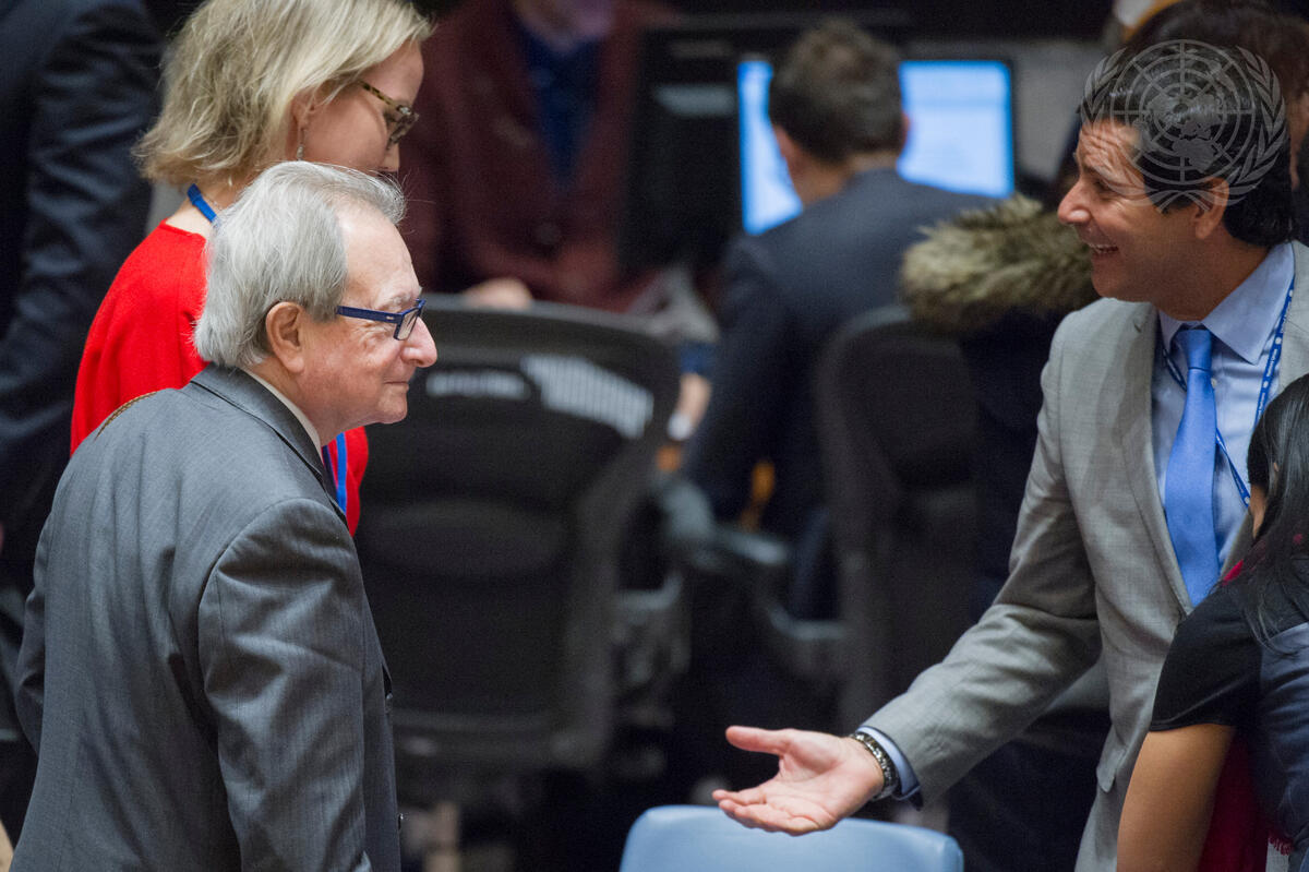 Judge Carmel Agius (foreground left), President of the International Criminal Tribunal for the Former Yugoslavia, at the Security Council meeting on the work of that Tribunal and the International Residual Mechanism for Criminal Tribunals.