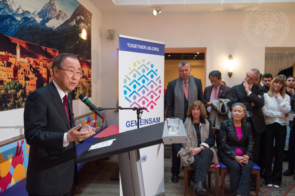 Secretary-General Ban Ki-moon (left) speaks at the Habibi & Hawara Restaurant in Vienna to showcase the UN-System-Wide Campaign, “TOGETHER: Respect, Safety & Dignity for All”. Seated, at right, is Yoo Soon-taek, his wife.
