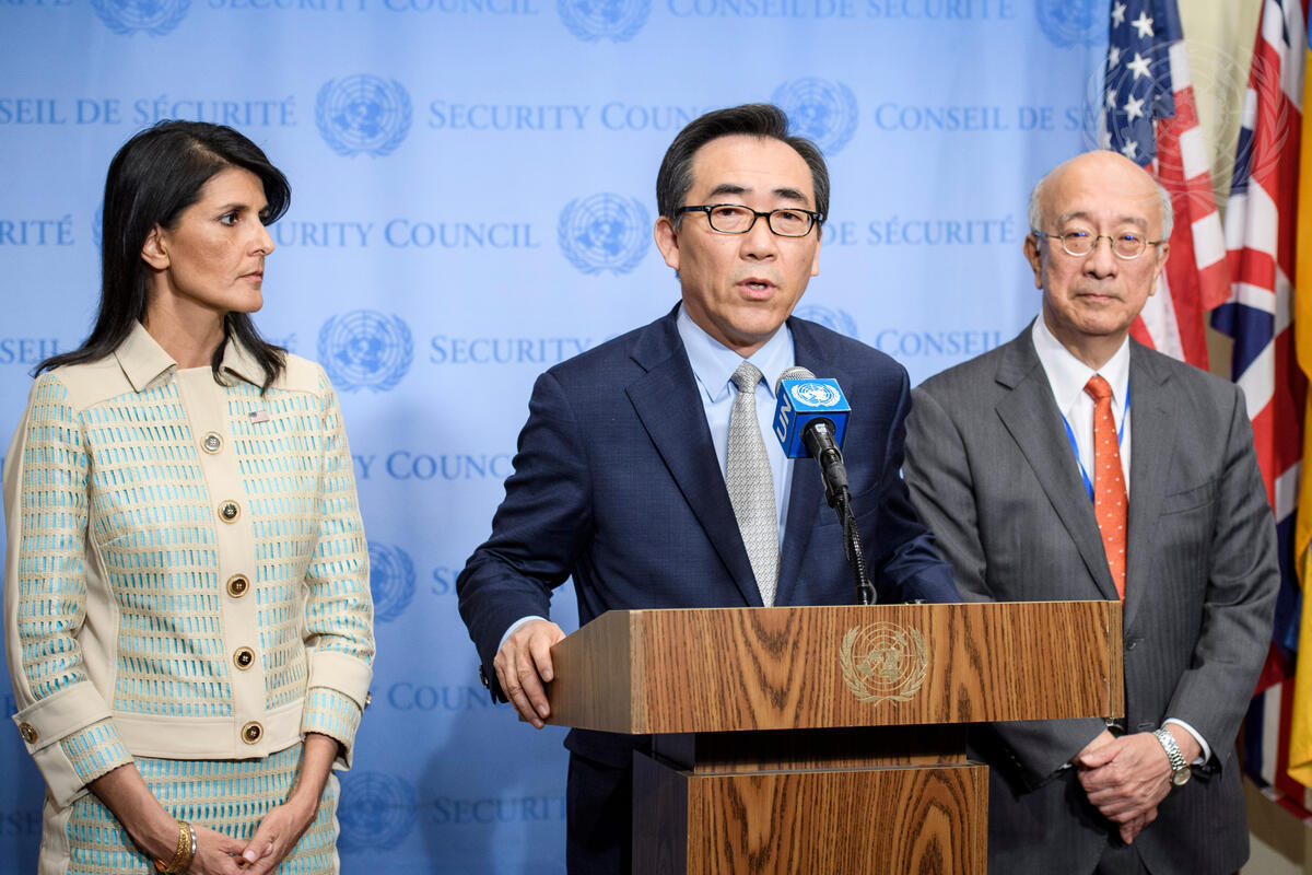 Cho Tae-yul (centre), Permanent Representative of the Republic of Korea to the UN, speaks to journalists prior to closed-door Security Council consultations on the most recent missile launch by the Democratic People’s Republic of Korea (DPRK). Also addressing reporters with him were Nikki R. Haley (left), United States Permanent Representative; and Koro Bessho, Permanent Representative of Japan.