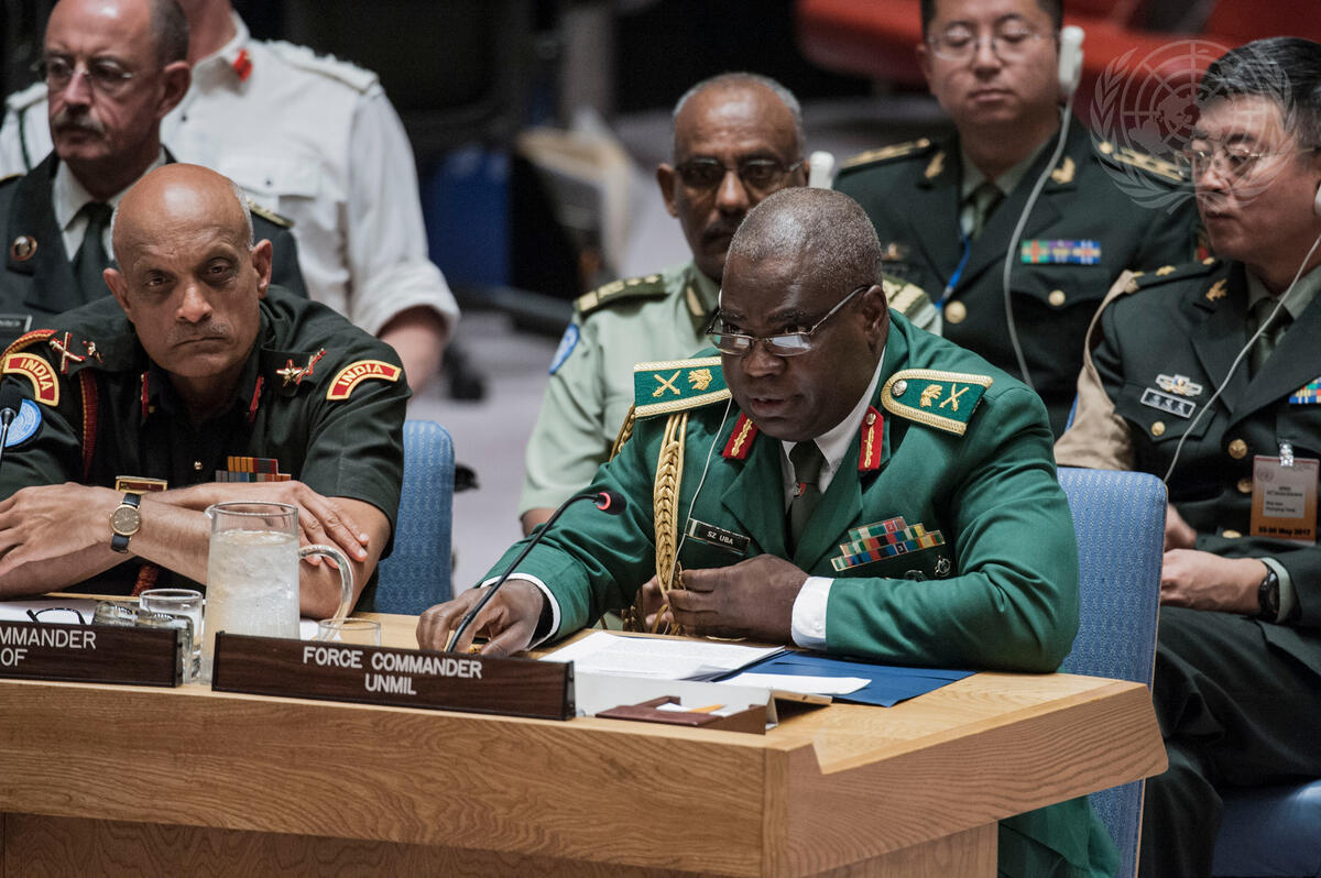 Major General Salihu Zaway Uba (front right), Force Commander of the United Nations Mission in Liberia (UNMIL), addresses the Security Council meeting on UN peacekeeping operations. At his side is Major-General Jai Shanker Menon, Head of Mission and Force Commander of the United Nations Disengagement Observer Force (UNDOF).