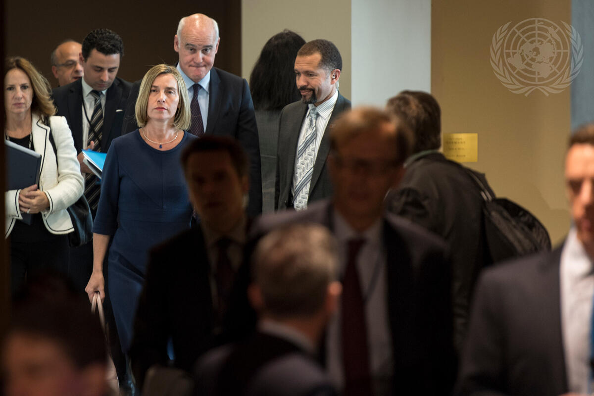 Federica Mogherini (centre), European Union High Representative for Foreign Affairs and Security Policy and Vice-President of the European Commission, on her to speak journalists after addressing the Security Council meeting on cooperation between the United Nations and the EU in maintaining international peace and security.