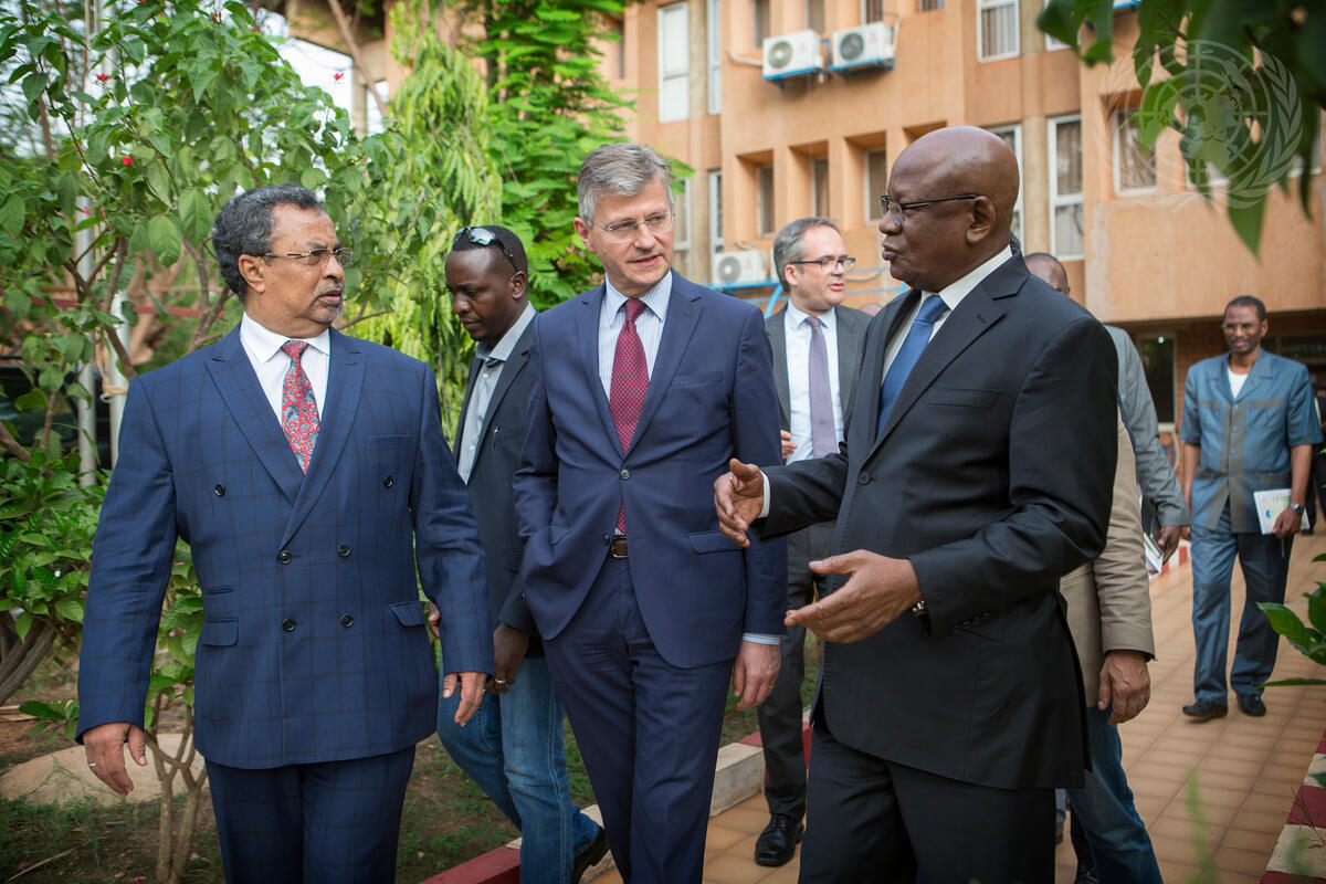 Jean-Pierre Lacroix (centre), Under-Secretary-General for Peacekeeping Operations, during his visit to Mali, with Mamadou Diagouraga (right), High Representative of the President of Mali for the Agreement on Peace and Reconciliation in the country; and Mahamat Saleh Annadif (left), Special Representative of the Secretary-General and Head of the UN Multidimensional Integrated Stabilization Mission in Mali (MINUSMA).