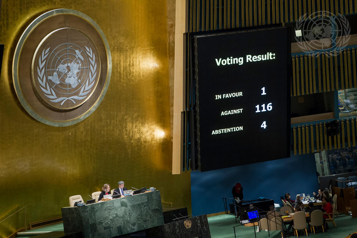 By a recorded vote of 116 against to 1 in favour (Armenia), with 4 abstentions (France, Mauritius, Nigeria, Palau), the Assembly first rejected a motion for division of the resolution into two separate votes. The Assembly then adopted the text as a whole.