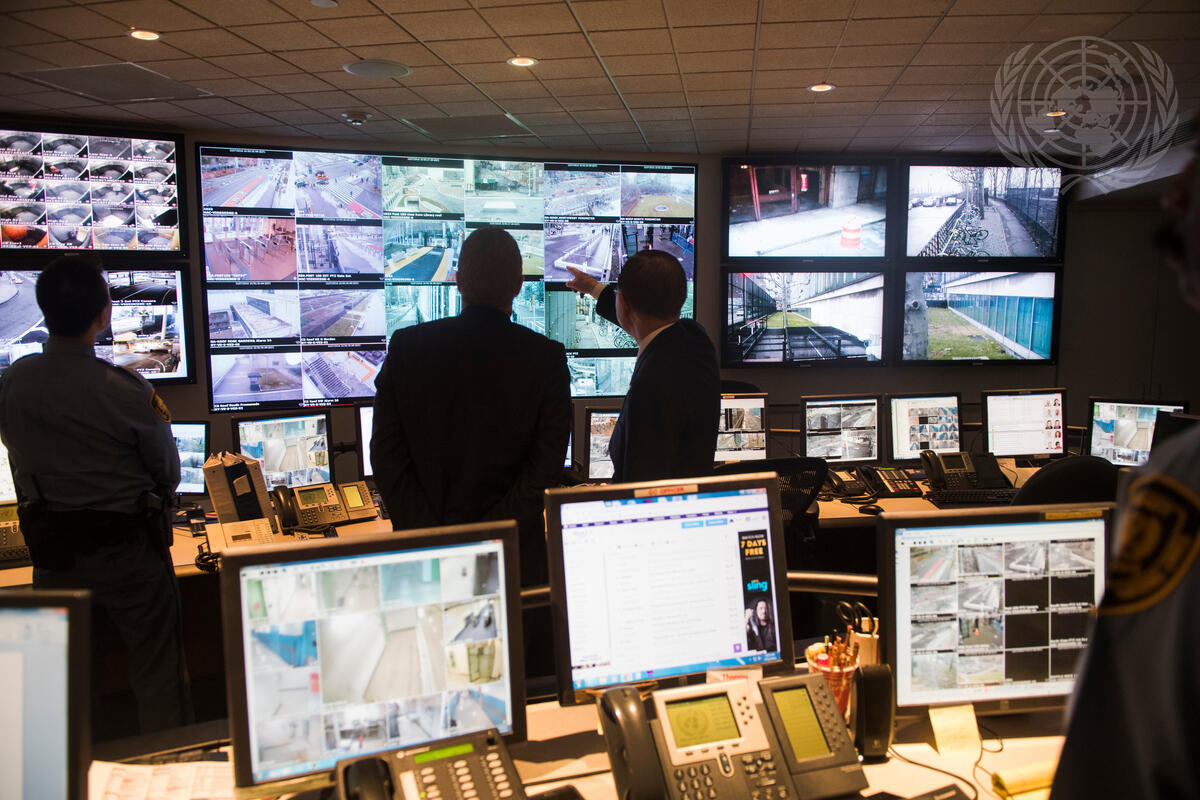 Secretary-General Ban Ki-moon (third from left), who concludes his tenure at the end of the year, pays a farewell visit to the Security Operation Centre at UN headquarters.