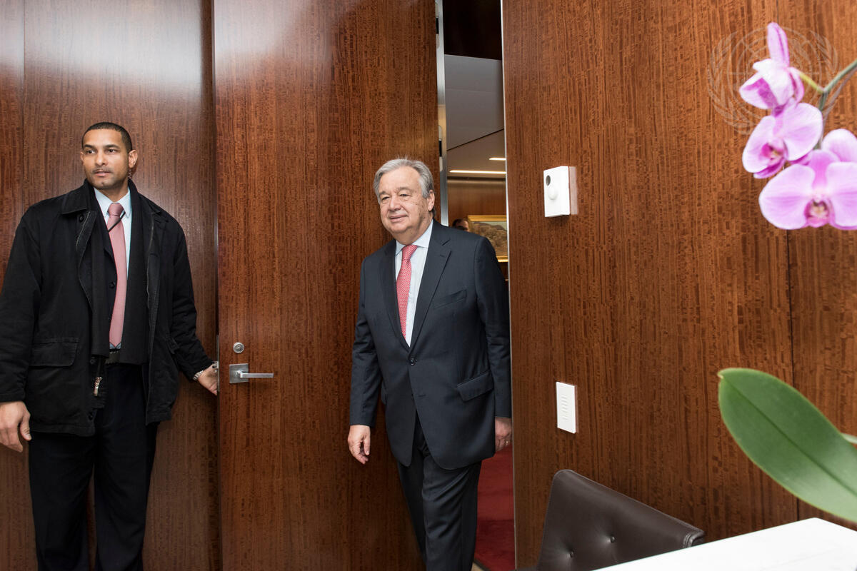 António Guterres (right), new Secretary-General of the United Nations, arrives in his office on his first day at work.