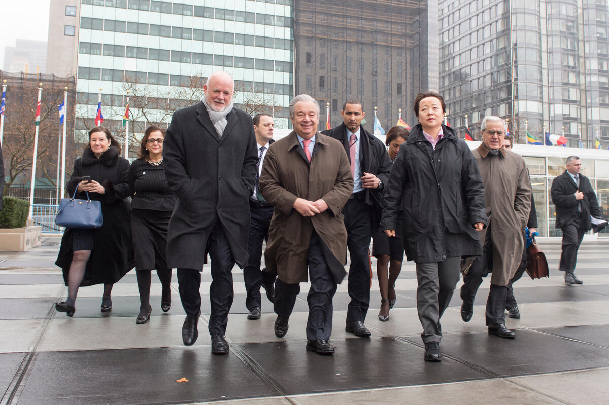 Mr. Guterres (centre) arrives for the wreath-laying ceremony accompanied by Peter Thomson (front left), President of the seventy-first session of the General Assembly.