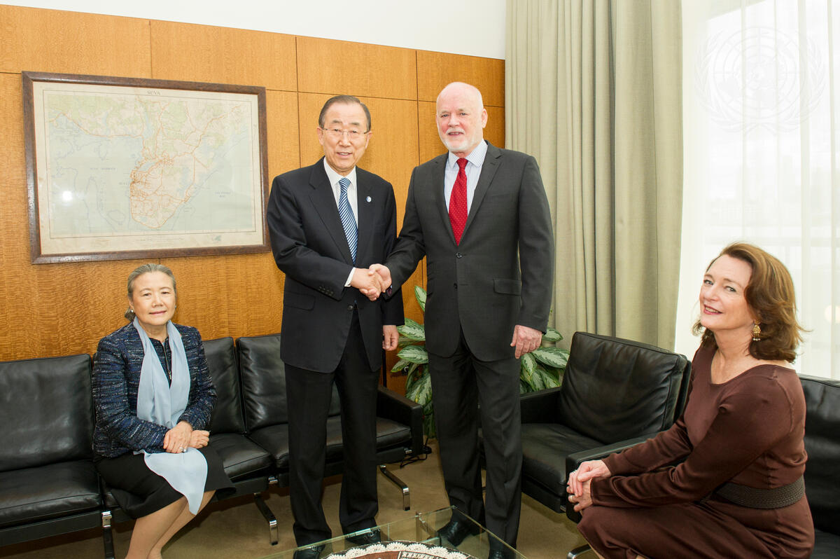 Mr. Ban (centre left) with Peter Thomson, President of the seventy-first session of the General Assembly. also pictured: Mrs. Ban (left) and Marijcke Anne Thomson, wife of the Assembly President.