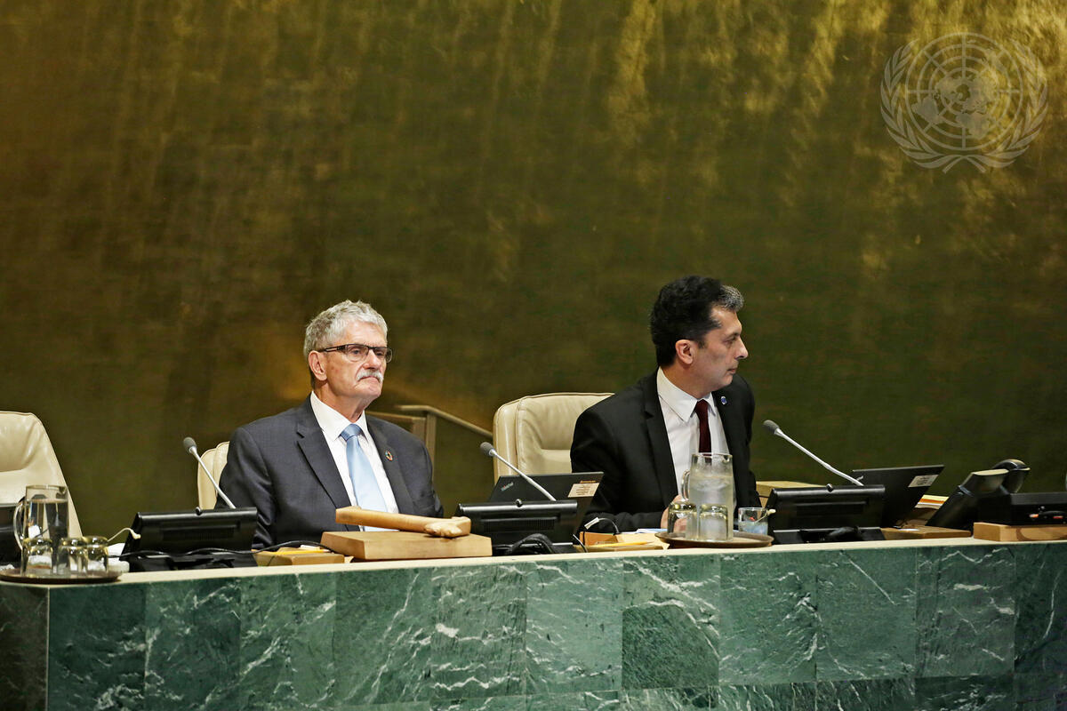Mogens Lykketoft (left), President of the seventieth session of the General Assembly, chairs the Assembly’s meeting on revitalization of the Assembly's work.