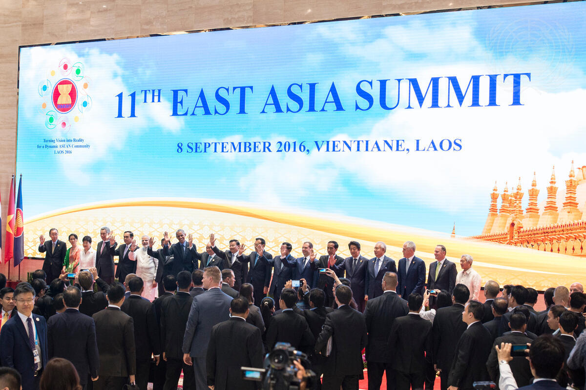 Secretary-General Ban Ki-moon (top left) poses for a group photo with participants of the 11th East Asia Summit, in Vientiane, Lao People’s Democratic Republic.