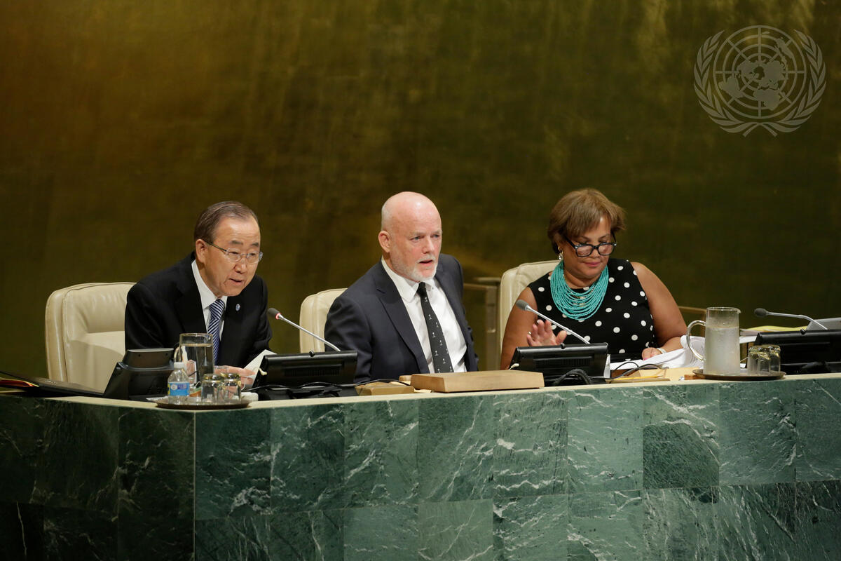 Secretary-General Ban Ki-moon (left) addresses the opening meeting of the seventy-first session of the General Assembly. Also pictured: Peter Thomson, incoming President of the Assembly; and Catherine Pollard, Under-Secretary-General for General Assembly and Conference Management (DGACM).
