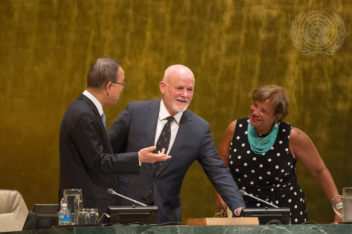 Peter Thomson (centre), President of the seventy-first session the General Assembly, takes his seat to chair the session’s opening meeting. He is flanked by Secretary-General Ban Ki-moon (left) and Catherine Pollard, Under-Secretary-General for General Assembly and Conference Management (DGACM).