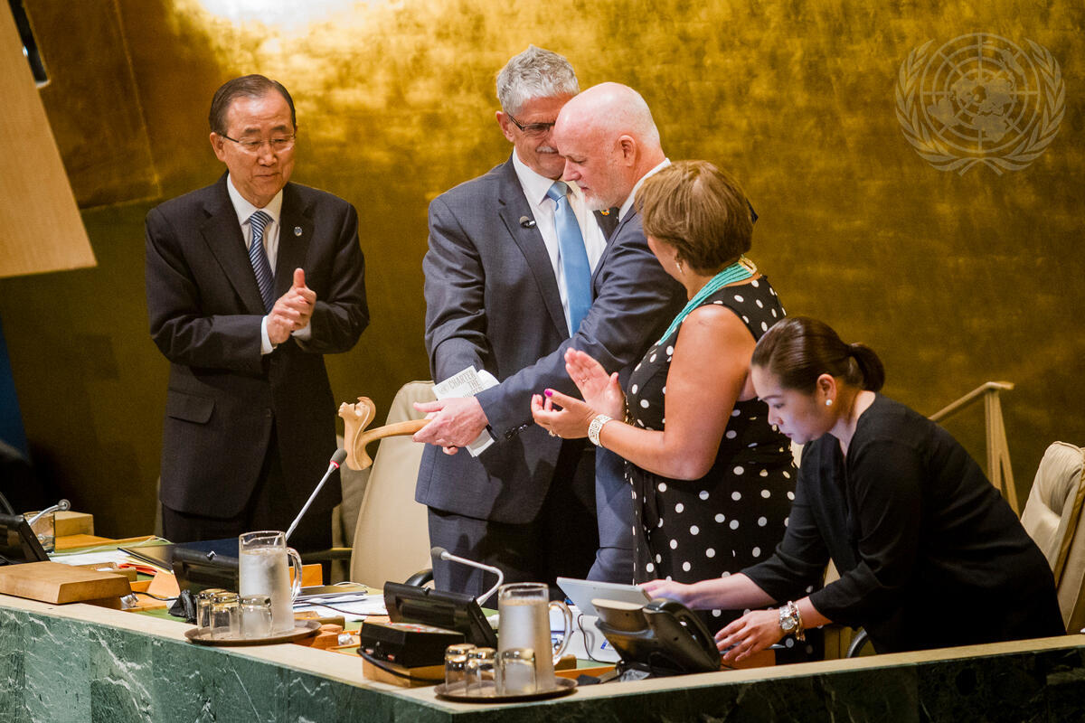 Mogens Lykketoft (centre left) President of the seventieth session of the General Assembly, hands over the gavel to his successor, Peter Thomson, at the transition between the two sessions. Pictured looking on: Secretary-General Ban Ki-moon (left) and Catherine Pollard (centre right), Under-Secretary-General for General Assembly and Conference Management.