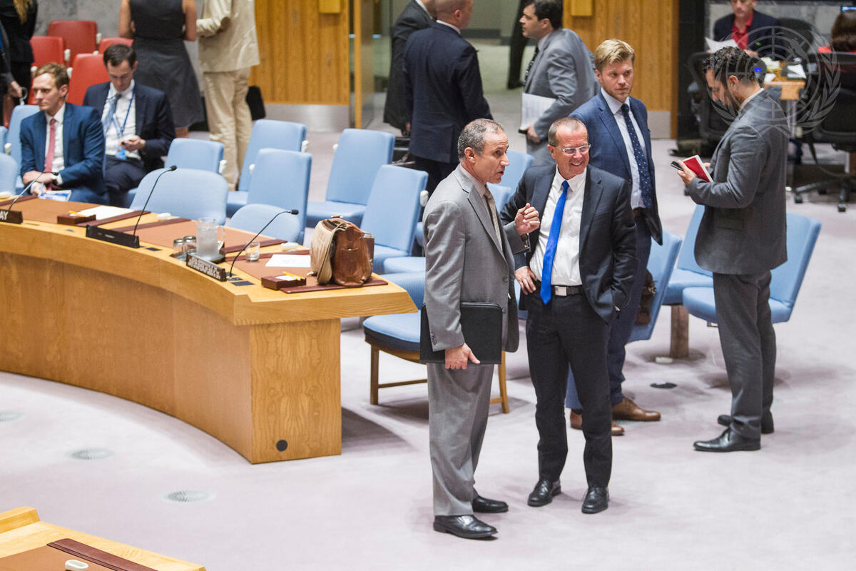 Martin Kobler (third from right), Special Representative of the Secretary-General and Head of the UN Support Mission in Libya (UNSMIL), with Elmahdi S. Elmajerbi, Deputy Permanent Representative of Libya to the UN, at the Security Council meeting on the situation in that country.