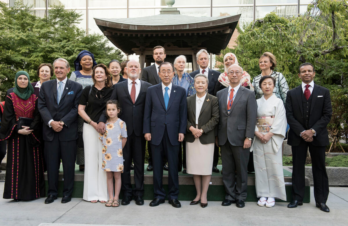 Group Photo following the Peace Bell Ceremony on the Occasion of the 35th Anniversary of the International Day of Peace (21 September). Participants include UN Messengers of Peace Leonardo DiCaprio, Michael Douglas, Jane Goodall, Midori, Stevie Wonder; Nobel Laureates Leymah Gbowee, Tawakul Karman, Shirin Ebadi; Global Teacher Prize Laureate Hanan Al Hroub. In the front row are Jan Eliasson, Deputy Secretary-General; Peter Thomson, President of the seventy-first session of the General Assembly; and Secretary-General Ban Ki-moon and his wife Yoo Soon-taek.
